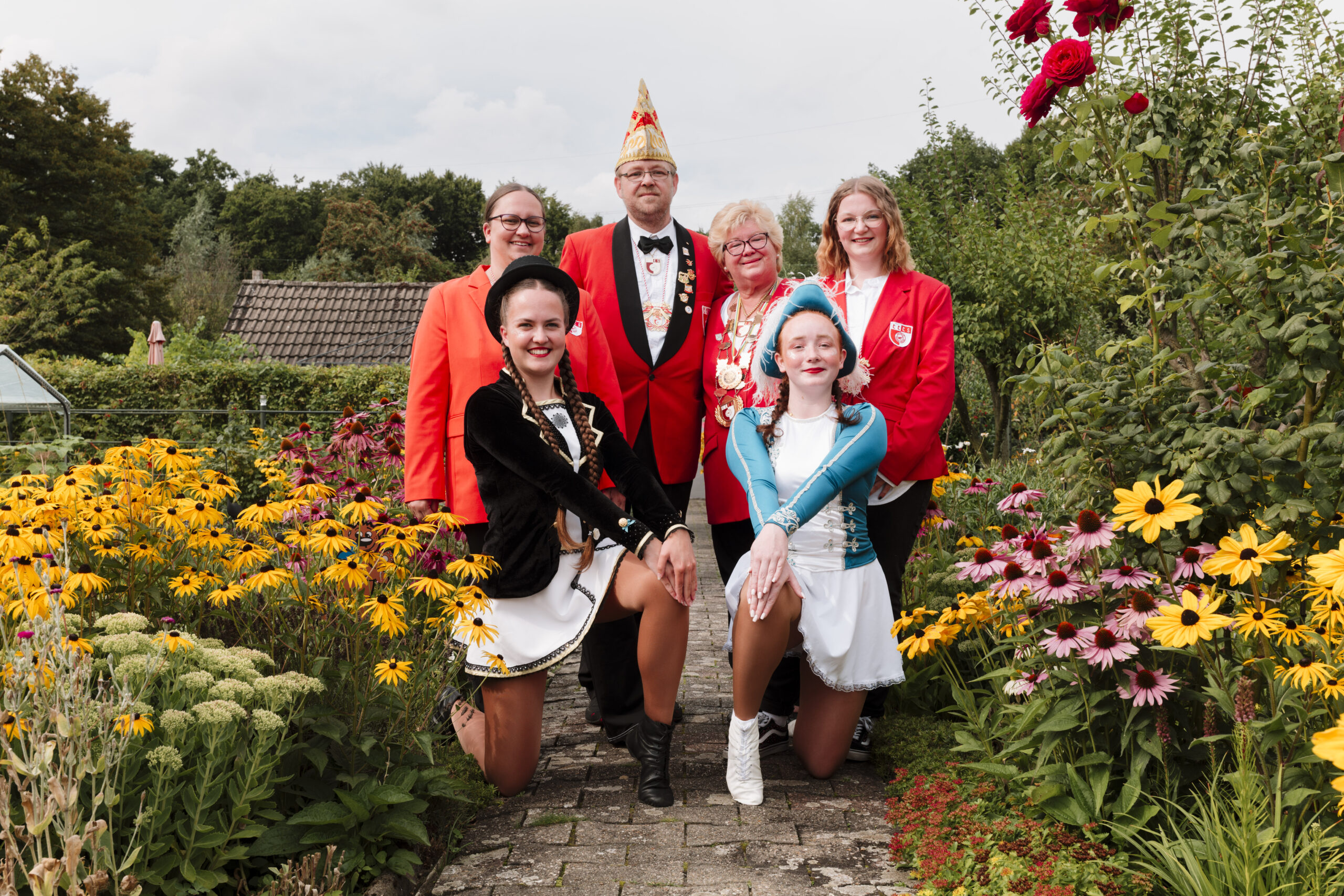 Heute treffen sich das Ehepaar Alberts, die Ehrenpräsidentin Cornelia Straßmann, die seit 1969 Vereinsmitglied ist, die Solomariechen Lisa und Anastasia (beide 19 Jahre jung) und die Gardetänzerin Fenja Ernst im befreundeten Kleingartenverein. Für unseren Fototermin tragen die Mariechen sogar die Gardeuniform. (Sie zu tragen ist außerhalb der Session eigentliche streng verboten, verfügt der Bund Deutscher Karneval. Genauso wie das Tragen von Orden und Kappen. Aber heute ist eine Ausnahme.)